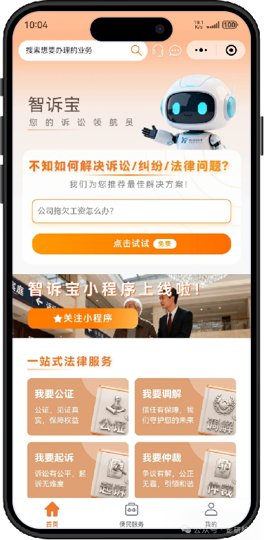以微信小程序为核心载体,用户无需下载安装,通过微信搜索“智诉宝” 即可进入使用,适配移动端操作场景,支持随时随地便捷访问。