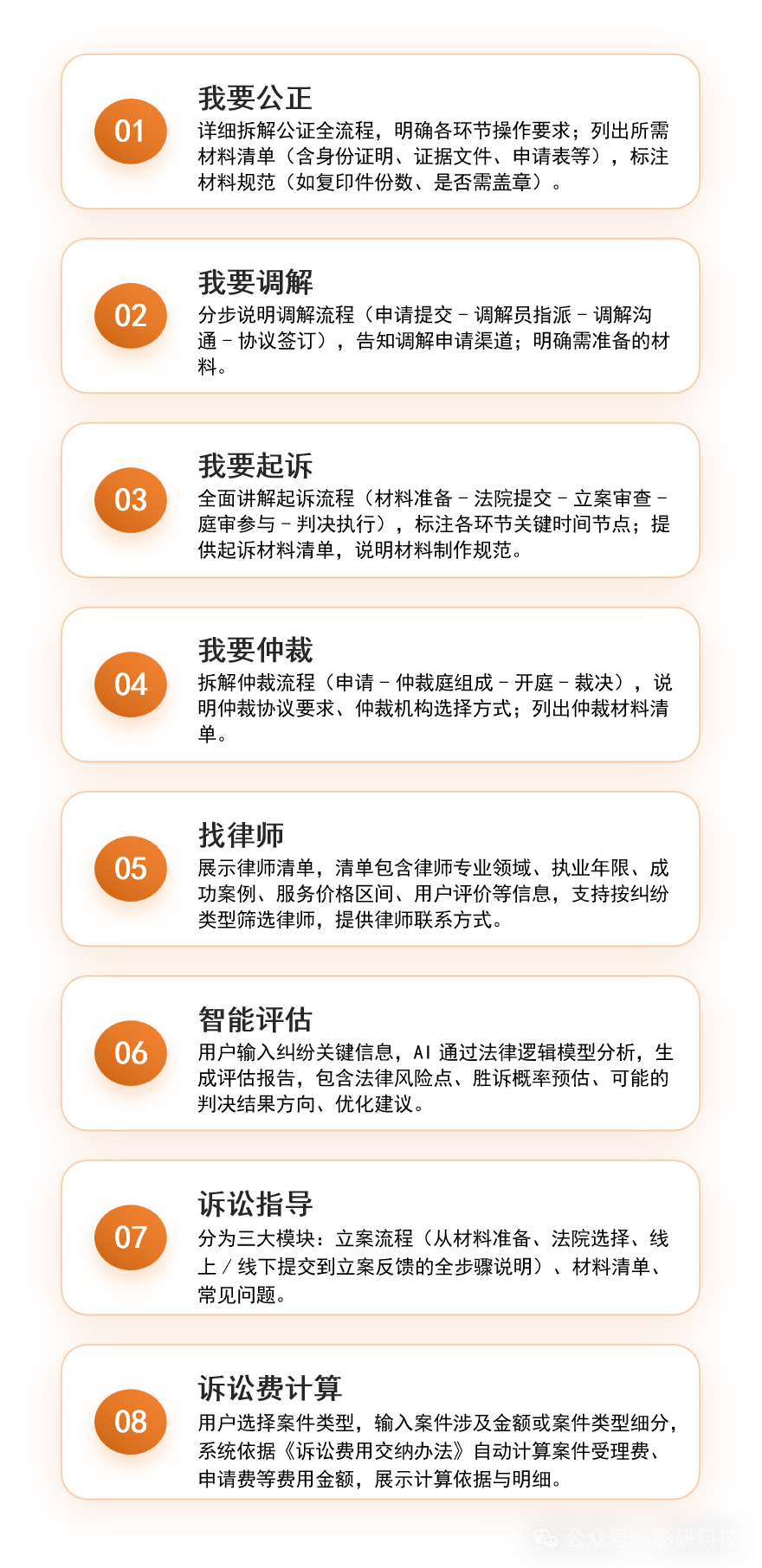 覆盖纠纷解决全流程,从初步咨询(问题咨询)、多元解决途径(公正、调解、起诉、仲裁)、专业辅助(找律师、智能评估)到工具支持(文书制作、诉讼指导、费用计算),满足用户从纠纷初期到解决后的全场景需求。