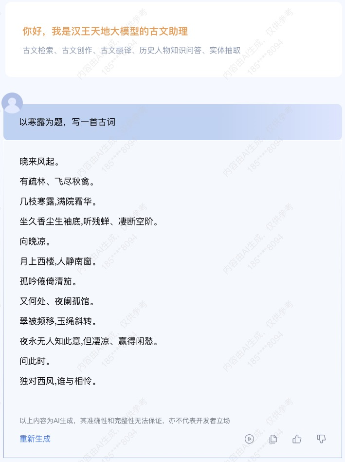 汉王基于自主研发的古汉语大模型,面向图书馆古籍、文献数字化应用,构建了古汉语工具平台,包括且不限于古籍句读、文言文转白话文、信息抽取、古籍档案智能著录等应用。通过在模型预训练阶段大规模古籍与历史人文语料的注入,提升古汉语模型在此领域的基础能力,并借助古汉语研究领域特定任务的微调训练,提升可落地的场景任务处理能力,同时将大模型语义理解能力与专业知识库的数据融合,大幅提升古汉语大模型的定向问答能力。经过人机多维度的对比评测,汉王古汉语大模型在古籍的信息抽取与整理、历史人文知识问答以及古文翻译、诗词写作、对联等古文创作能力上,都超越通用大模型ChatGPT以及GPT4为代表的通用大模型。